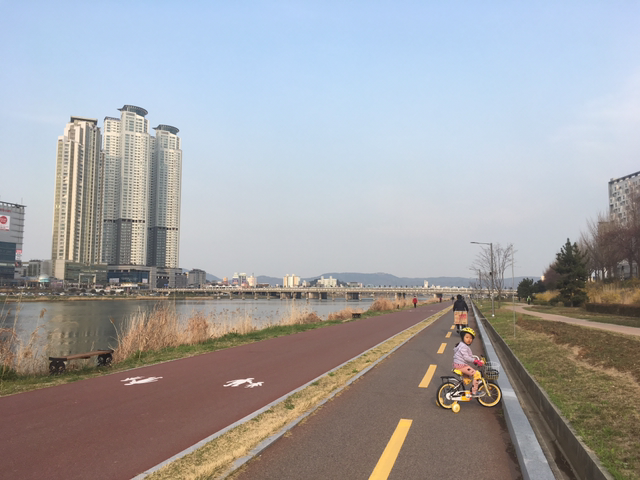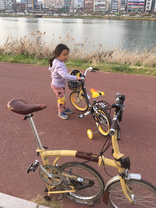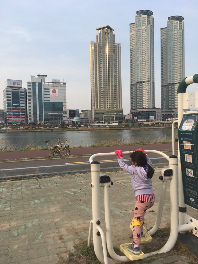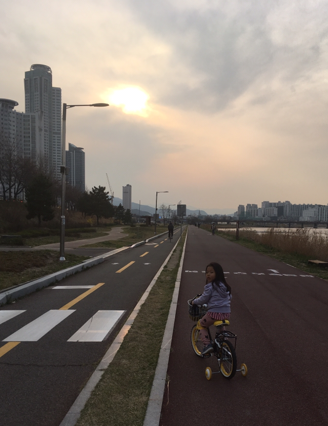 해 질 녘 태화강변을딸내미랑 자전거로 훑는다.운동기구들도 만지작 만지작.내리막길 질주하다아파트 쪽문에 쾅 부딪힌 조안.좌측 뺨에 발그레 멍이 생겼다.졸지에 볼 빨간 유년기!