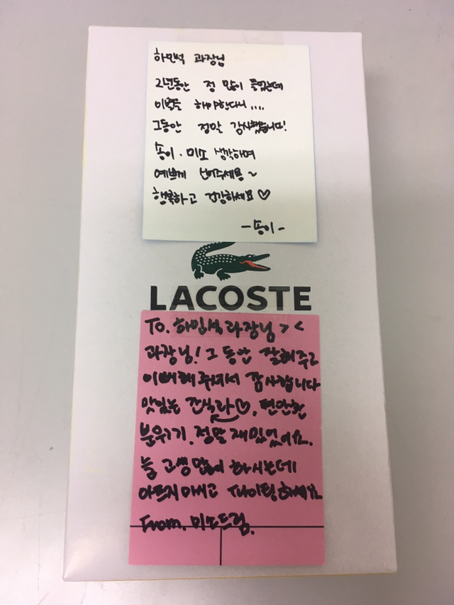 발랄하게 출근한 주말. 나이트 근무 마친 아이들이 뭔가를 건넨다. "열어보세요." 오호라, 양말이로구나. 훈훈한 편지도 박스에 박혀 있다. 이번 달까지만 일하는 응급구조사들. 이렇게 또 떠나보낸다.