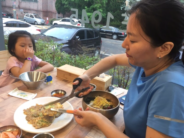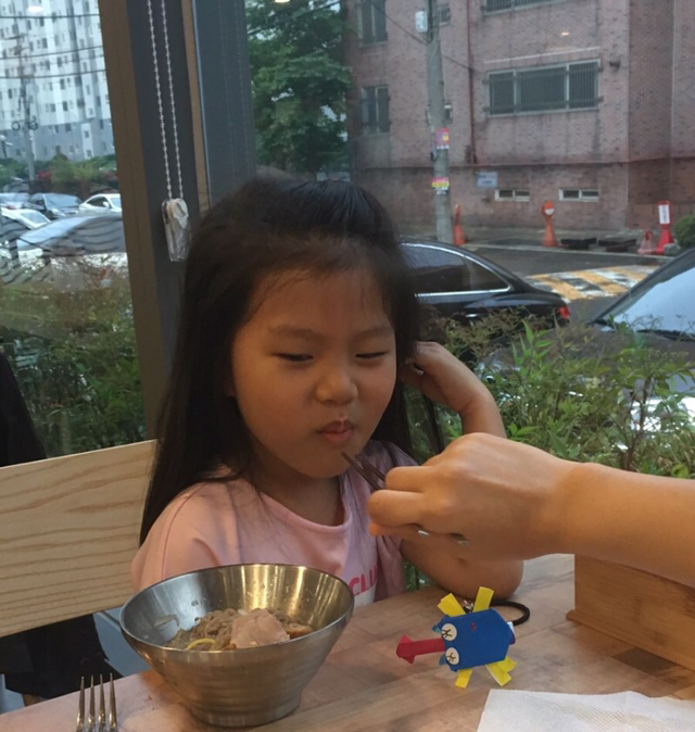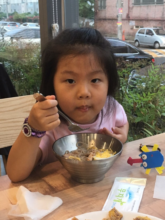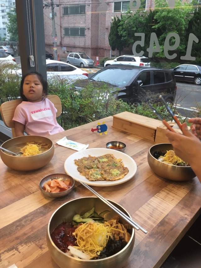 정족산 무제치늪을 함께 누빈 아내, 유치원 파한 아이랑 냉면과 육전을 음미한다. 아내가 시킨 섞음면(비빔냉면에 찬 육수)과 조안이가 먹던 물냉면까지 호로록.
