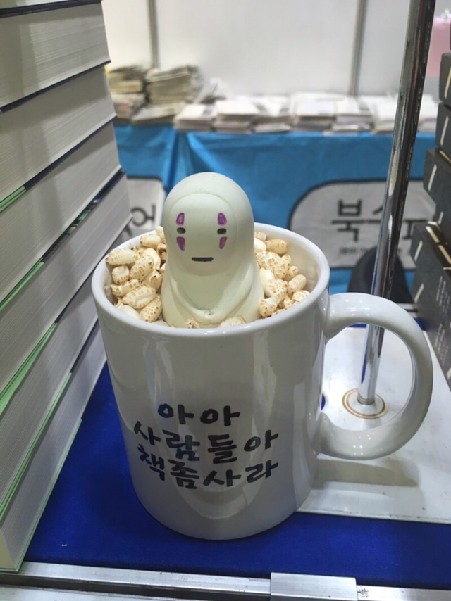 북스피어 김홍민 대표님이 꾸리시는 부스에 찾아가서 울산에서 챙겨온 몽쉘을 건네고, 그가 쓴 책까지 들이댄다. 저자 사인 마친 김 사장님께서 신박한 컵을 보여주신다. 뜨거운 물을 부으면 숨겨진 문구가 드러나네. 무척 탐스럽다.
