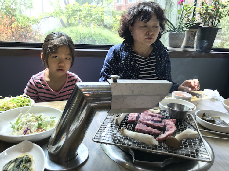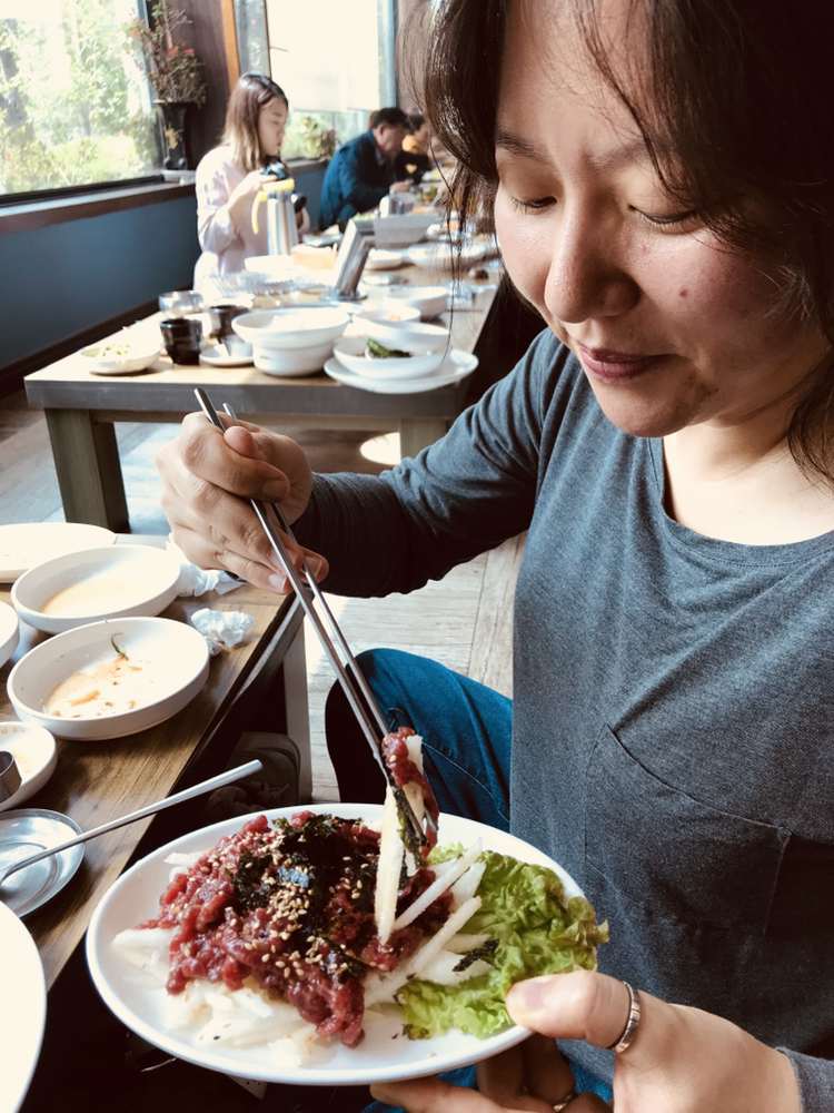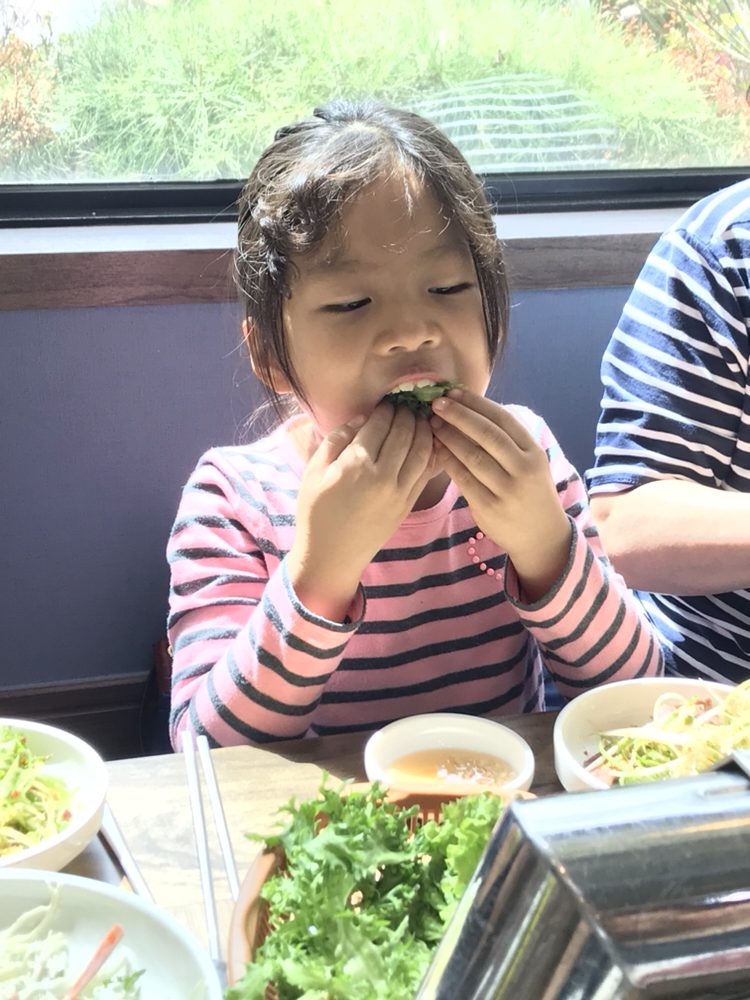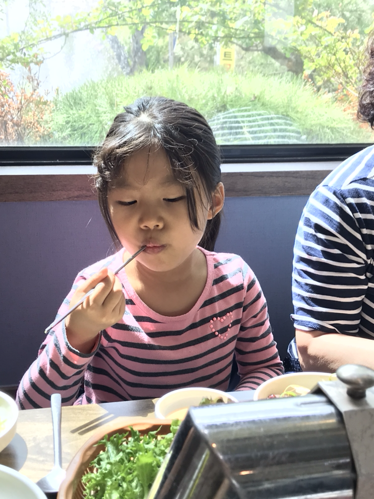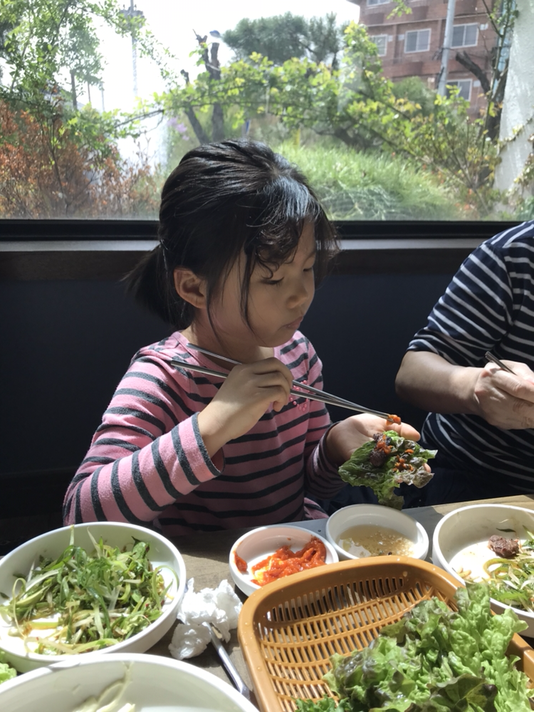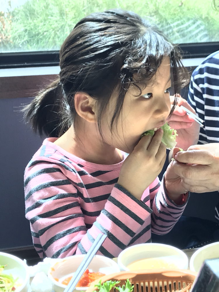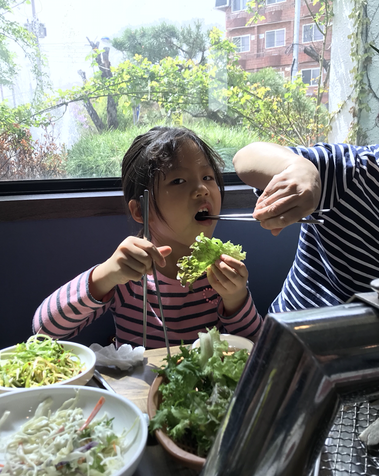 상추에 고기 얹고 쌈장 바른다. 김치까지 올려달라고 요구한다.