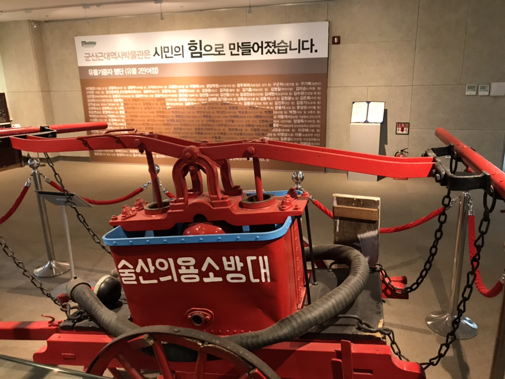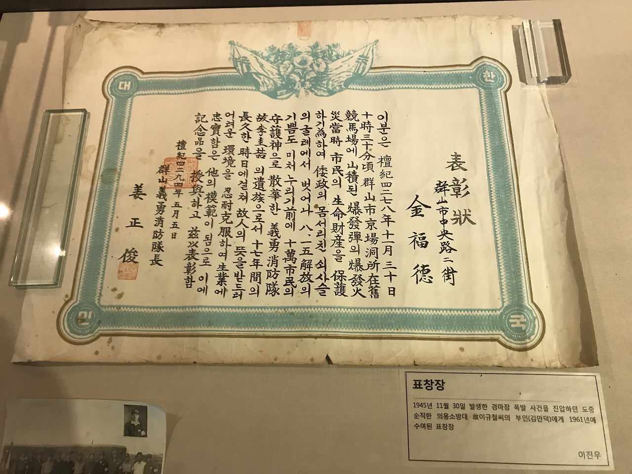 소박한 소방차와 해방된 해에 화재 진압하다 순직한 소방대원의 아내에게 수여된 표창장도 훑는다.