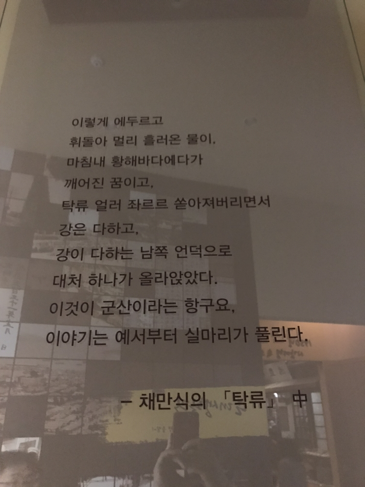 이렇게 에두르고 휘돌아 멀리 흘러온 물이, 마침내 황해(黃海)바다에다가 깨어진 꿈이고, 탁류째 얼러 좌르르 쏟아져 버리면서 강은 다하고, 강이 다하는 남쪽 언덕으로 대처(大處) 하나가 올라앉았다. 이것이 군산(群山)이라는 항구요, 이야기는 예서부터 실마리가 풀린다.