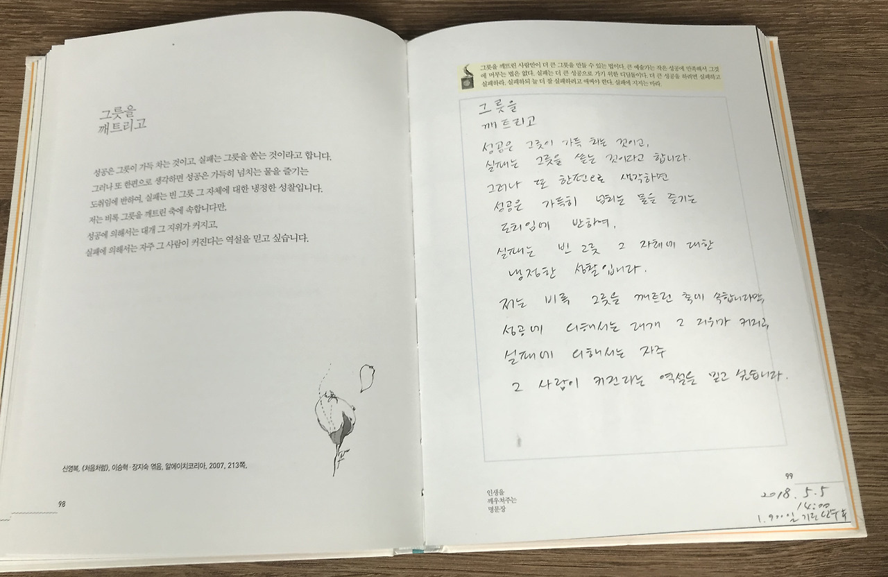 신영복 교수님의 <처음처럼> 한 토막을 끼적였다. 어린이날에 1,900일차 정성 공부가 완료된 걸 자축하며.
