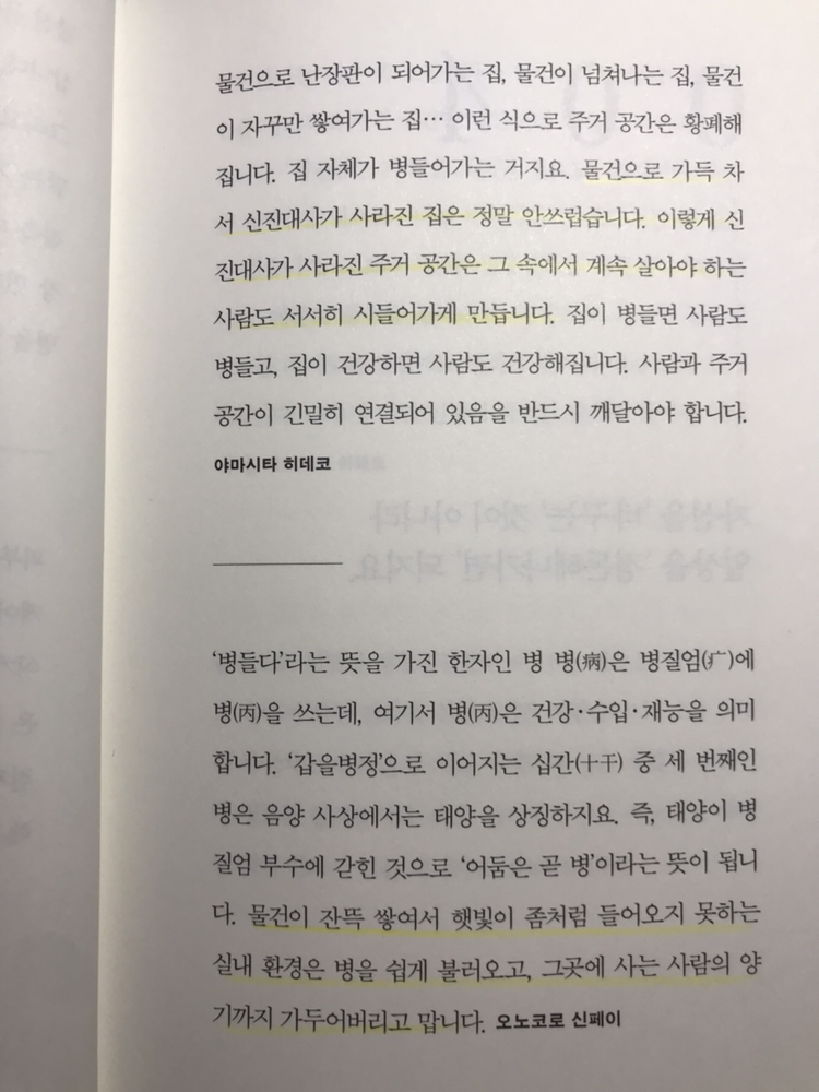 그리고 정리의 첫 단추로 집을 거론한다. ‘집이란 우리 생명을 담는 거대한 그릇입니다. 집 정리를 게을리하는 것, 집 손질을 미루는 것은 생명을 함부로 다루는 것과 같아요. 가장 먼저 주거 공간을 정리해봅시다. 그것이야말로 진정 생명을 돌보는 행위입니다. 물건으로 가득 차서 신진대사가 사라진 집은 정말 안쓰럽습니다. 이렇게 신진대사가 사라진 주거 공간은 그 속에서 계속 살아야 하는 사람도 서서히 시들어가게 만듭니다.’