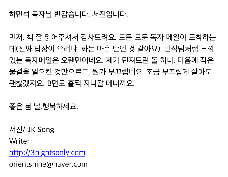 편지는 거의 쓰지 않는다. 메일도 마찬가지다. 스마트폰 시대에 그 무슨 망측한 짓인가. 그런데, 해버렸다. 구태의연한 뻘짓. 서재를 치우다 발굴한 책 한 권 때문이다. 제목에 낚였다. 아홉수에 걸려 허덕이는 중생의 여린 염통을 은근히 건드렸다. 결정타를 날린 건 책날개의 한 문장. ‘서진은 독자의 모든 이메일에 답한다.’ 과연 그럴까. 실험정신이 발동했다. 혹시나 했는데, 역시나! 아지트에서 포착한 해돋이 풍광 곁들인 서신에 응답이 당도했다. 짧지만 정겹다. 힘겹게 올라간 산봉우리에서 외친 고함에 뒤따르는 아련한 메아리랄까. 이게 뭐라고, 위로가 된다.