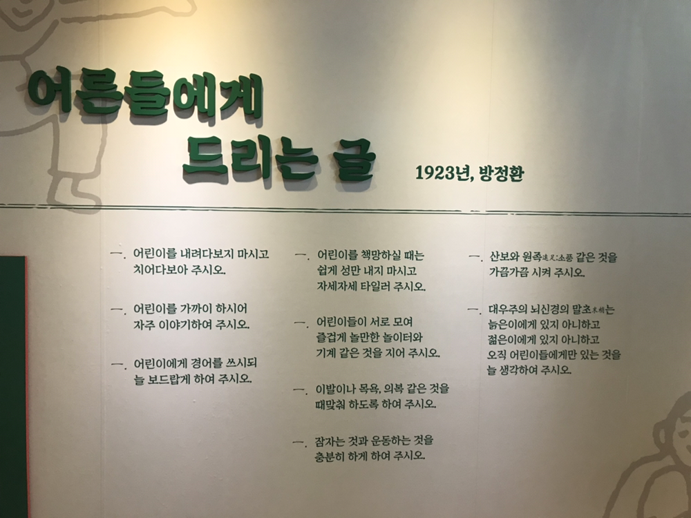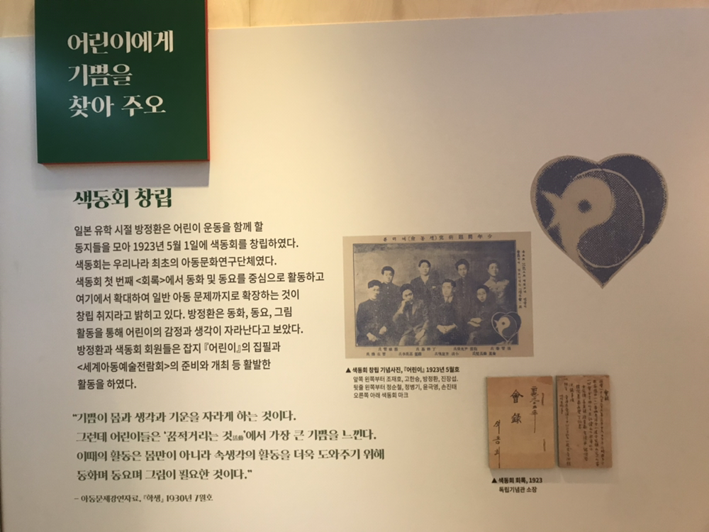 ‘뻗어 나가는 힘! 뛰노는 생명의 힘! 그것이 어린이다. 온 인류의 진화와 향상도 여기에 있는 것이다. 어린이에게 기쁨을 찾아주어야 한다. 기쁨이 몸과 생각과 기운을 자라게 하는 것이다. 그런데 어린이들은 ‘꿈적거리는 것(活動)’에서 가장 큰 기쁨을 느낀다. 속생각의 활동을 더욱 도와주기 위해 동화며 동요며 그림이 필요한 것이다.’ 우리나라 최초의 아동문화연구단체 색동회까지 창립한 그는 여러 매체를 통해 아이의 기쁨과 활동을 누누이 강조한다.