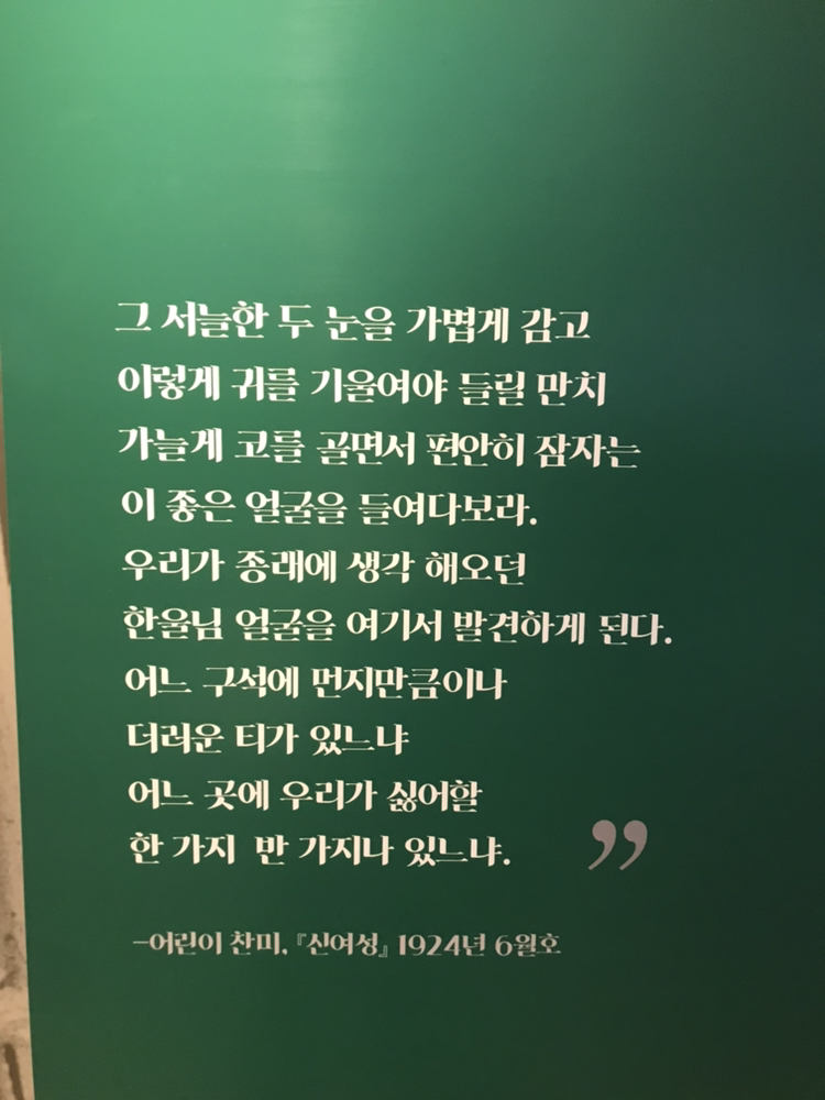 ‘그 서늘한 두 눈을 가볍게 감고 이렇게 귀를 기울여야 들릴 만치 가늘게 코를 골면서 편안히 잠자는 이 좋은 얼굴을 들여다보라. 우리가 종래에 생각 해오던 한울님 얼굴을 여기서 발견하게 된다. 어느 구석에 먼지만큼이나 더러운 티가 있느냐. 어느 곳에 우리가 싫어할 한 가지 만 가지가 있느냐.’