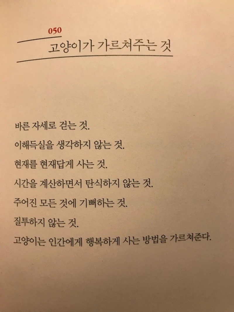 살아가는 일은 어쩌면 상처받는 일입니다. 자신을 적극적으로 착취하는 이만 살아남는 한국 사회에선 더더욱 그렇습니다. 세로토닌의 기본은 슬로(slow)와 심플(simple)과 스몰(small)이라죠. 뭉근하게, 단순하게, 단출하게 사는 게 상처 치유의 요체입니다. 이 삼위를 일체로 탑재한 생명체가 고양이 아닐까 싶네요.
