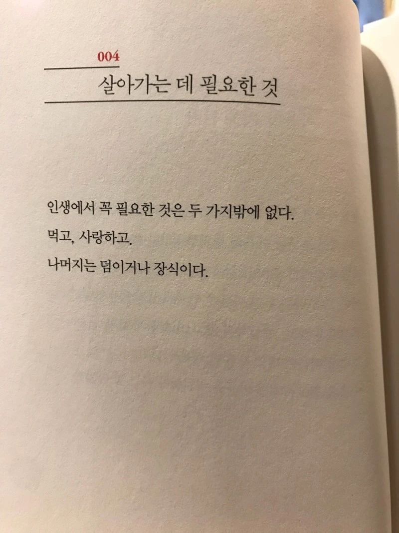영화로도 만들어진, 엘리자베스 길버트의 베스트셀러 제목이 떠오르는 대목도 있습니다. “인생에서 꼭 필요한 것은 두 가지밖에 없다. 먹고, 사랑하고. 나머지는 덤이거나 장식이다.”