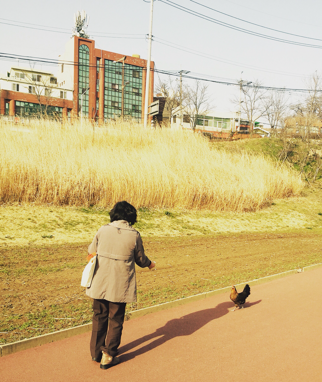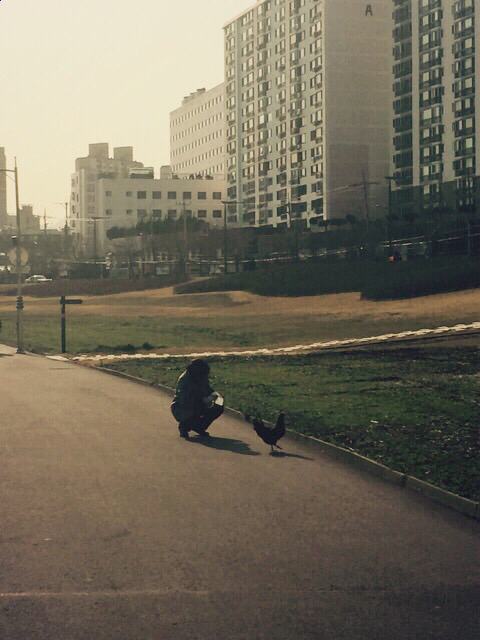 반려견 데리고 거니는 시민들 틈바구니에서 단연코 돋보인다. 애지중지 애완계 챙기는 아주머니.레드 캡 모델닭은 블랙 코트 뽐낸다.엣지있게 런웨이 워킹.닭느님이 도도하게 싸지른 계똥을 정성스레 갈무리하는 여인의 손길에 시선이 한참 머문다.그 자태, 숭고하다.느닷없이 감명 깊다.#한_마리_키워볼까#나중에_계모임이라도