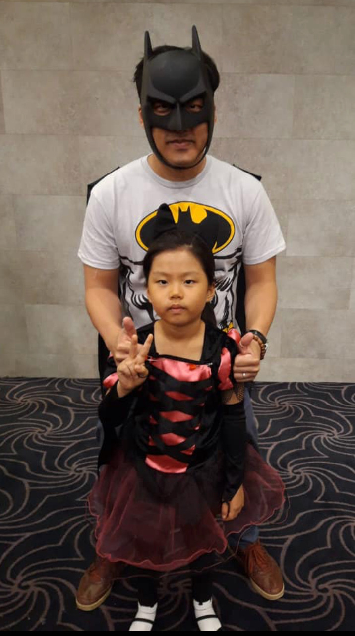 오사카 돈키호테에서 사온 처키 멜빵 바지에 가면을 쓸까 하다가 망토 달린 배트맨 셔츠 입었습니다. 아이가 cat 같은 bat 의상 입었으니 친자 확인 차원에서.