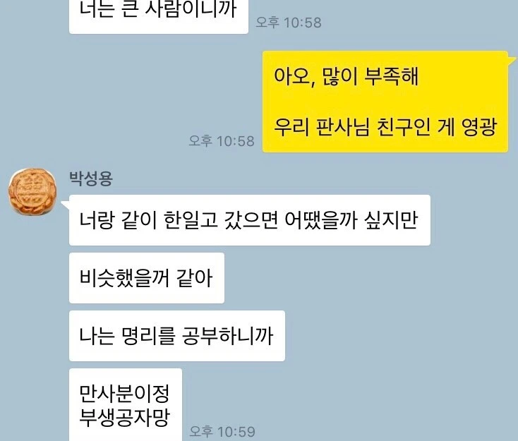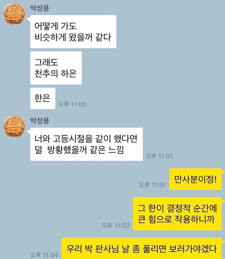 저랑 같이 한일고에 진학했다면 덜 방황했을 거 같다며, ‘만사분이정萬事分已定, 부생공자망浮生空自忙’을 언급할 땐 살짝 소름이 끼쳤습니다. 제가 명리로 사연 많은 이들 상담할 때 입버릇처럼 쓰는 표현이었거든요. 명리학까지 공부했다니, 역시나 소울메이트는 떨어져 지내도 통하나 봅니다.