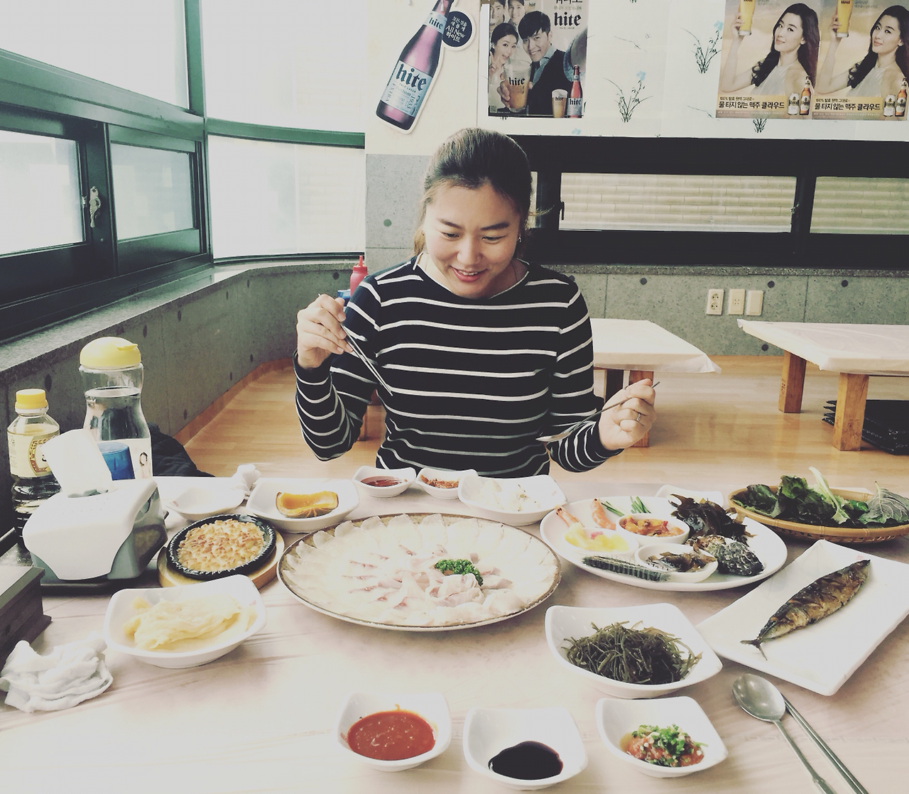 신나게 차 몰아울산 정자동까지 나왔다.간밤에 당직 서서 오늘은 오프인 김 원장과 오찬 '회'동.광어와 밀치, 굉장히 보드랍다.심지어 달달하다.일주일 한복판의 여유, 중독성 짙다.