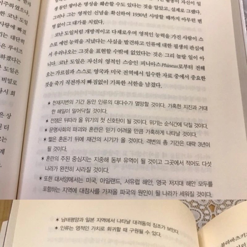 “지진과 해일로 우리나라 동남 해안 일백 리 땅이 피해를 입게 되나 서부 해안쪽으로 두 배의 땅이 융기하여 국토가 늘어날 것이다. 지금은 중국에 속한 만주와 요동 반도 일부가 대한민국에 복속된다. 북극 빙하가 녹으면서 미국 서해와 일본 영토의 2/3 정도가 침몰한다. 지진에 의한 원자력 발전소 폭발로 핵을 가진 나라가 위험에 처한다.”