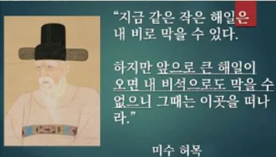 비석을 세운 허미수 선생은 간곡히 당부하였습니다. “지금의 작은 해일이나 수해(水害)는 이 비석으로도 막을 수 있지만, 앞으로 이곳 관동지방에 대화재(火災)가 많이 일어나면 그 다음에는 나의 비석으로도 못 막을 거대한 해일(海溢)이 닥쳐올 것이다. 그때가 되면 그 누구도 살아남지 못한다. 대화재(火災)가 많이 일어나면 이곳 관동을 떠나 다른 내륙으로 가야 한다. 그나마도 안 되면 두타산 꼭대기에 솥단지 하나 들고 피난을 가야 살아남을 수가 있다.”