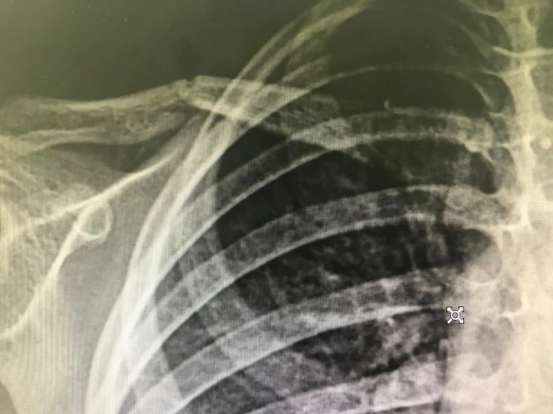 세 살 공주님이 응급실에 왔습니다. 겁먹은 눈망울 아래 오른쪽 볼에 울긋불긋 찰과상이 생겼네요. 목욕탕에서 넘어졌답니다. 오른 어깨가 아프다길래 사진을 찍었습니다. 가벼운 타박상이길 기대했는데 아이쿠, 이런! 우측 쇄골이 부러졌네요. 히라가나와 가타카나의 へ(he)자처럼.