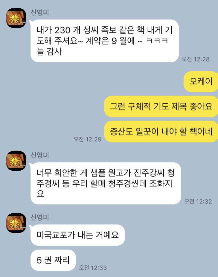 저를 만난 이후 출판업에 종사하는 그녀에게 성씨 족보 책자 제작 의뢰가 들어왔다네요. 샘플 원고에 담긴 건 상제님 성씨인 진주 강씨와 신 도제 조모 성씨인 청주 경慶씨 이야기. 경씨 할머니 일주日柱가 신영미 도제 생년 간지干支와 같은 경자庚子이셨답니다.