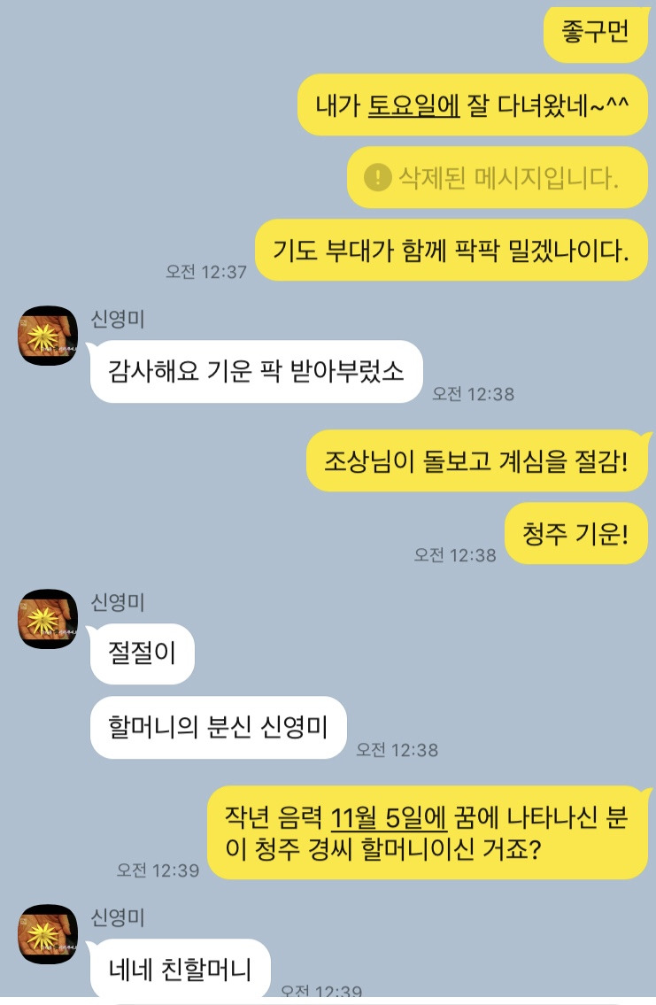 작년 음력 11월 5일(신영미 생일), 폐렴 앓던 신 도제 모친께서 심정지가 올 정도로 상태가 악화되셨었답니다. 그날 밤 꿈에 경씨 할머니께서 나오시더니 자기 며느리(신영미 모친)한테 왈, “아니, 아이 생일인데 미역국에 왜 고기도 없냐.”