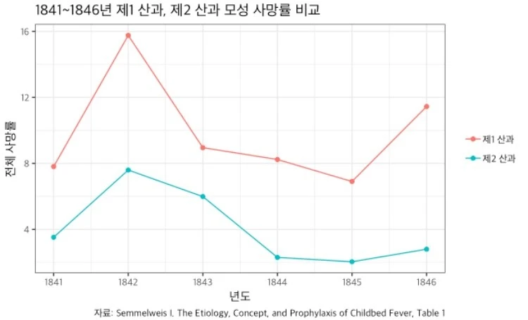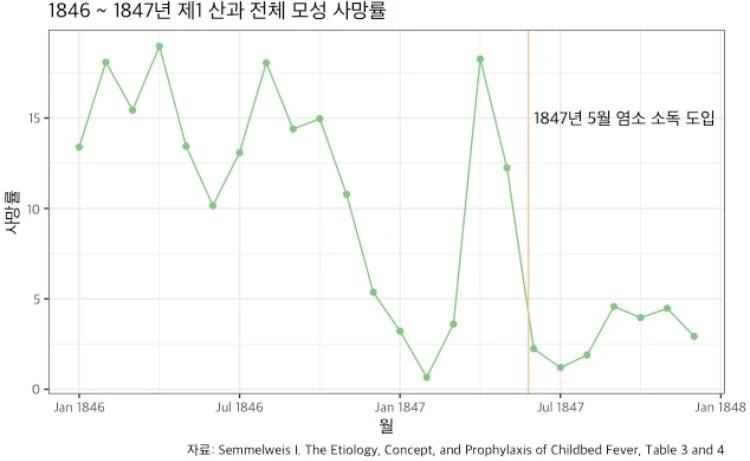 의사의 손에 묻은 ‘시체 입자(cadaverous particles)’ 때문에 산모들이 사망했다는 걸 자각한 제멜바이스는 부검 후 산모 진료 전에 염화칼슘액으로 손을 소독하도록 독려했습니다. 그 결과는 놀라웠습니다. 1병동 사망률이 90% 감소하여 2병동과 비슷한 수준이 됩니다.