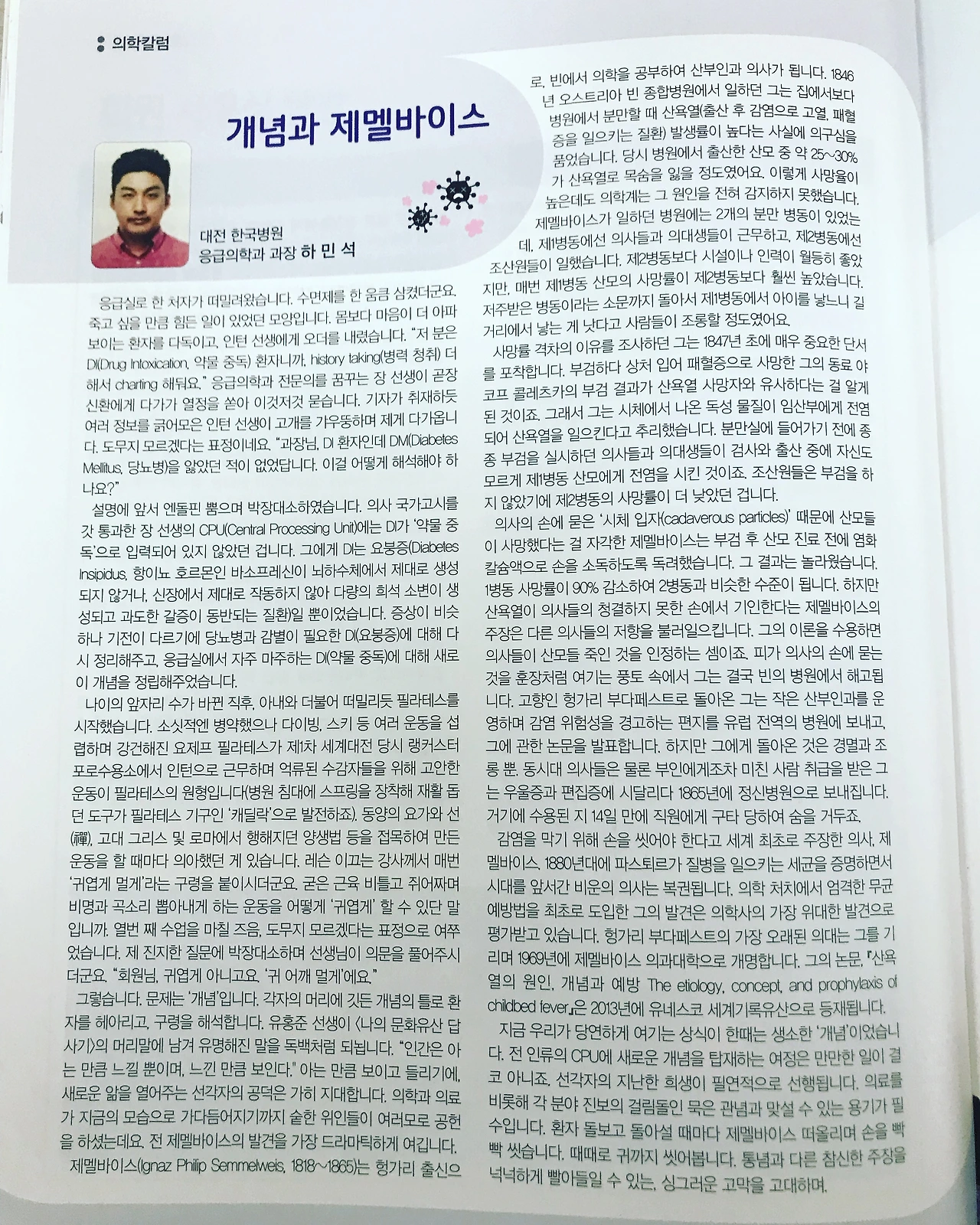 그렇습니다. 문제는 ‘개념’입니다. 각자의 머리에 깃든 개념의 틀로 환자를 헤아리고, 구령을 해석합니다. 유홍준 선생이 <나의 문화유산 답사기>의 머리말에 남겨 유명해진 말을 독백처럼 되뇝니다. “인간은 아는 만큼 느낄 뿐이며, 느낀 만큼 보인다." 아는 만큼 보이고 들리기에, 새로운 앎을 열어주는 선각자의 공덕은 가히 지대합니다. 의학과 의료가 지금의 모습으로 가다듬어지기까지 숱한 위인들이 여러모로 공헌을 하셨는데요. 전 제멜바이스의 발견을 가장 드라마틱하게 여깁니다.