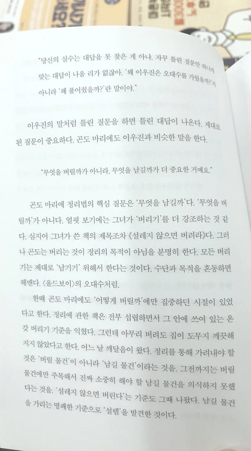 다음으로 만난 책은 <드디어 팔리기 시작했다>. 광고대행사 이노션의 기획자인 ‘임팩트주의자’ 안성은이 브랜드에 관한 흥미로운 통찰을 전해주네요. <설레지 않으면 버려라> 등을 펴낸 정리 컨설턴트 곤도 마리에 이야기를 의미 있게 되새깁니다. 틀린 질문을 하면 틀린 대답이 나온다죠. 수단과 목적을 혼동하면 헤맵니다. 정리의 대가께서 이를 일깨우시네요. “무엇을 버릴까가 아니라 무엇을 남길까가 더 중요한 거예요.”