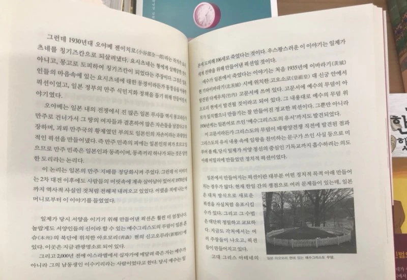 일본판 다빈치 코드는 1935년에 고오소코 신궁에서 발견된 다케우치 고문서에 처음 적혀 있었다네요. 예수 무덤이 아오모리 현에서 발견될 것도 고문서에 박혀 있답니다. 1936년에는 일본어로 쓰인 그리스도의 유서까지 발견됩니다. 일왕을 찬미하는 문구까지 유서에 적혀 있었다죠. 태평양 전쟁 직전에 고문서랑 예수 무덤 등이 발견된 점은 당시 일제가 서양 정신의 중심인 기독교까지 흡수하려 했다는 걸 입증합니다.