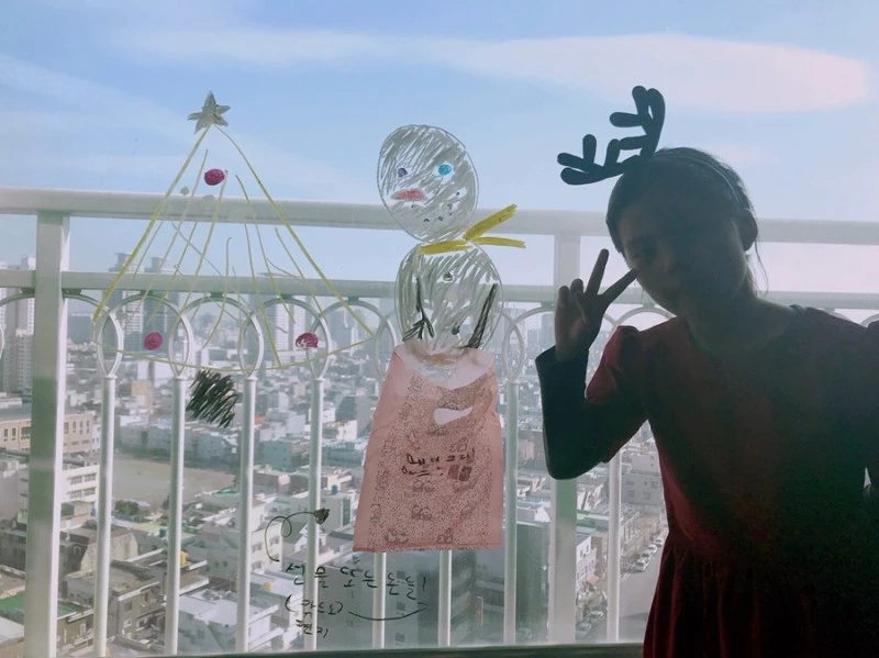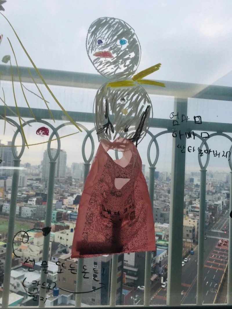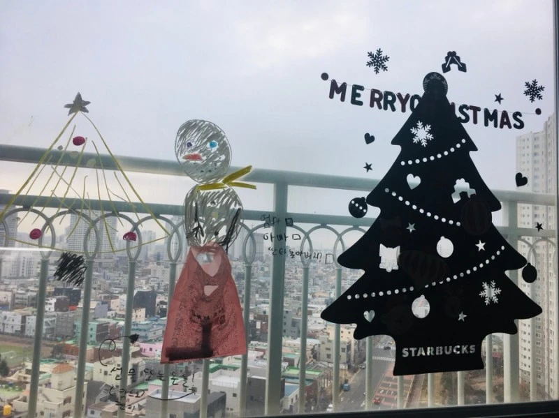 응급실에 내원한 여러 환자들 치료하고, 성탄절 아침에 퇴근해 울산에 왔어요. 거실 창에 딸이 봉투를 붙여놨네요.