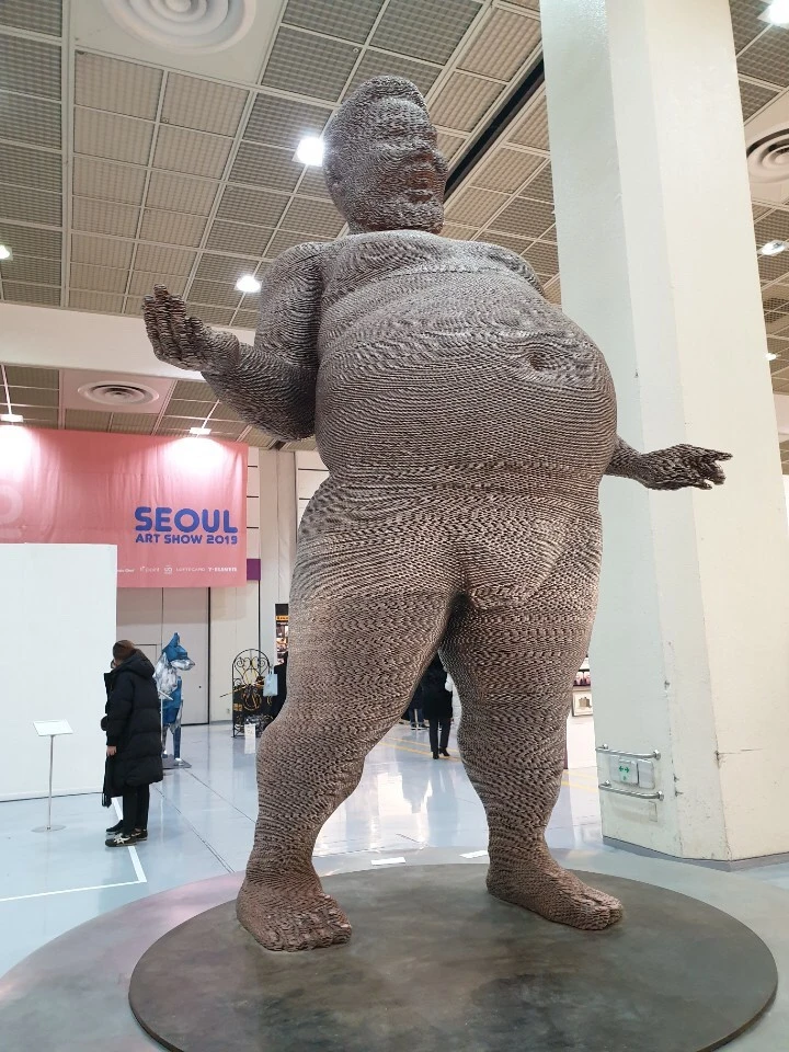 서울 아트쇼의 자이언트 또한 디테일의 위력을 일깨웁니다. 십 원짜리 동전을 쌓아서 만든 작품이에요. 거장의 일심이 거인 몸집에 집약되어 있습니다. 거대한 완성도 자그마한 동전 하나에서 비롯됩니다.