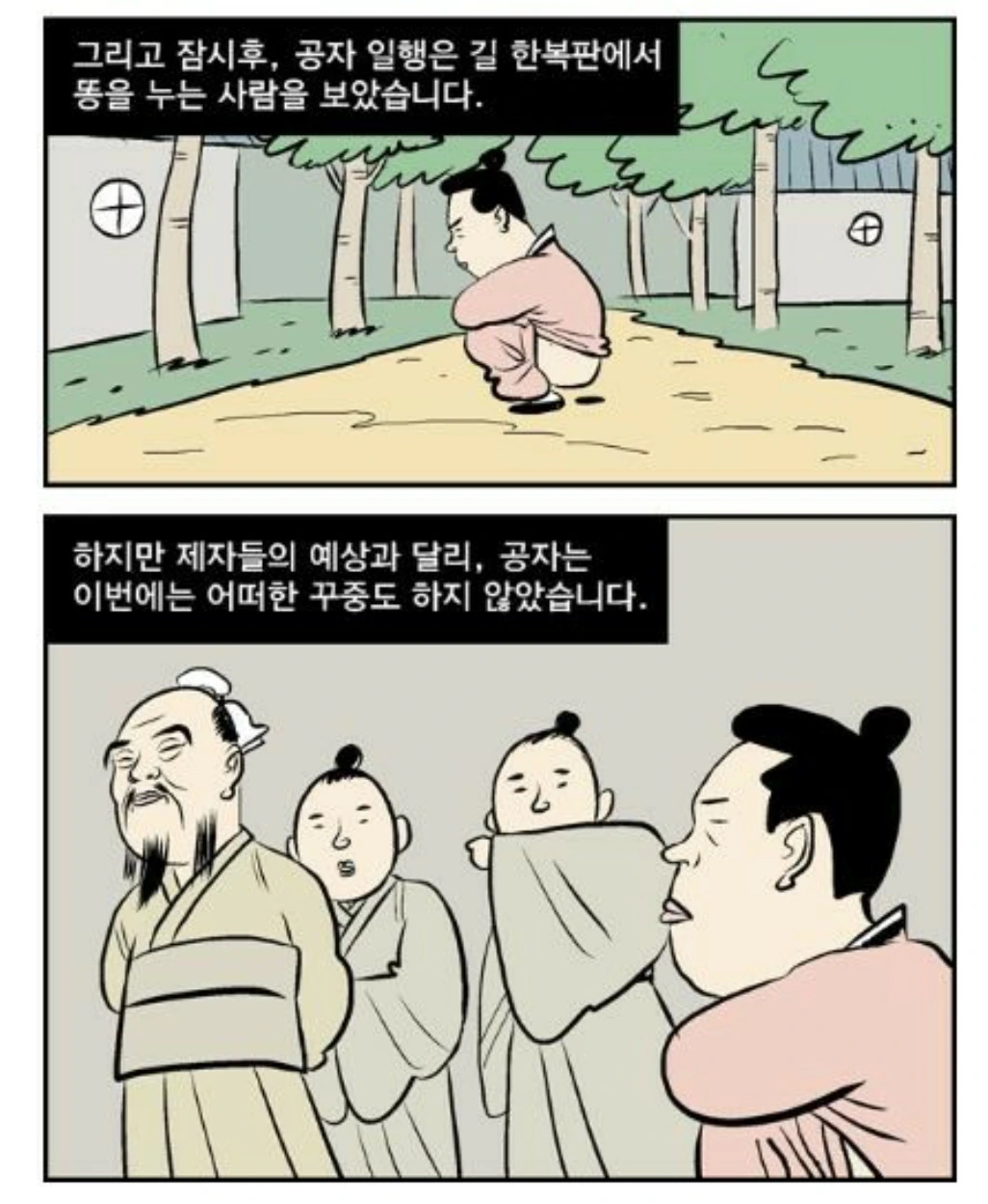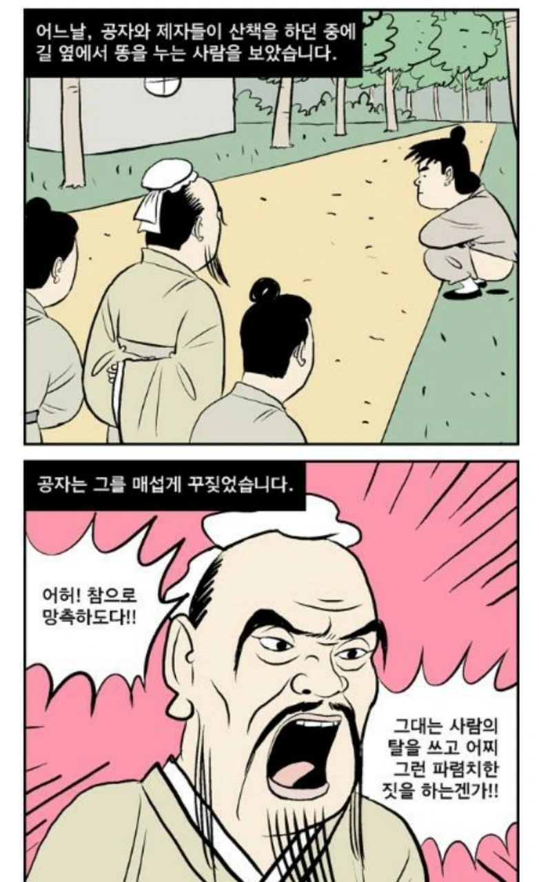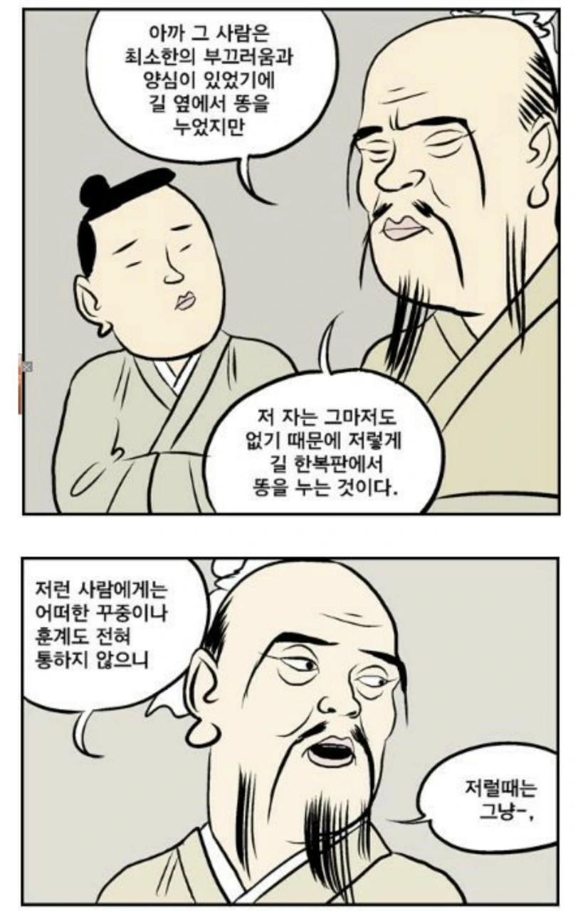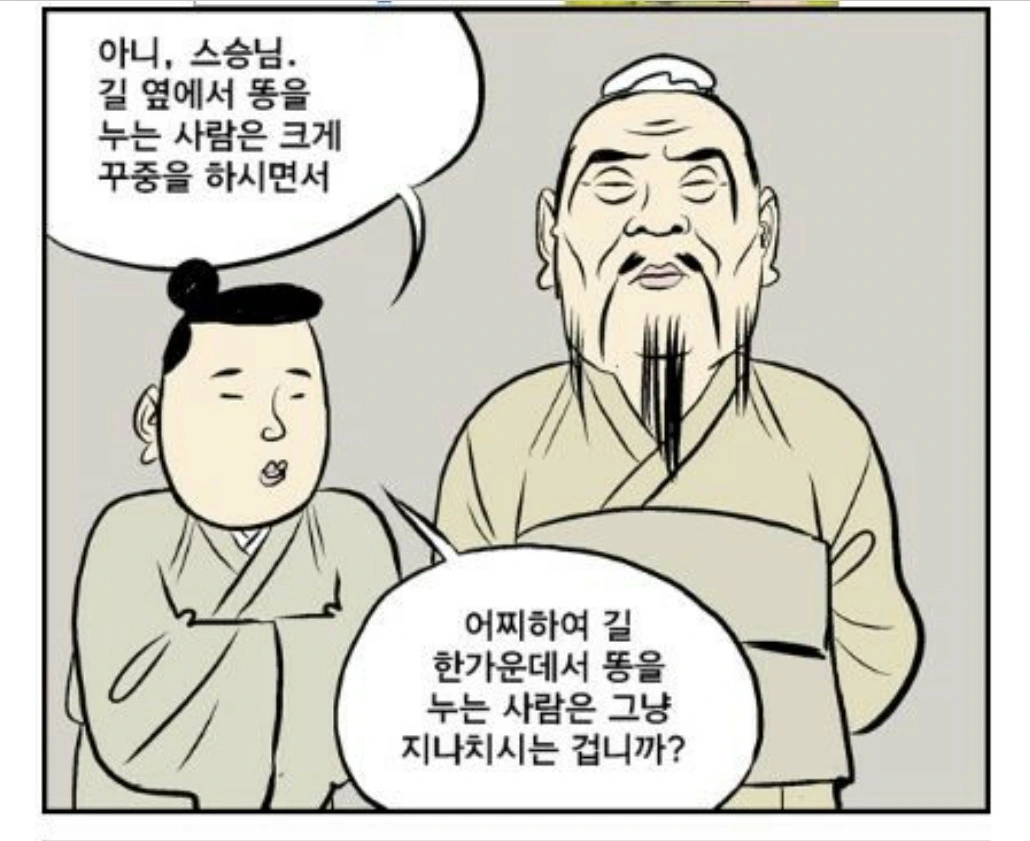 하루는 성도들을 데리고 길을 가시는데 어떤 사람이 인적이 드문 길에서 똥을 누고 있는지라. 상제님께서 성도들에게 “저기 저 놈이 길 가운데서 똥을 누는데 한 마디 하고 가랴, 그냥 가랴?” 하고 물으시더니 성도들이 미처 대답하기도 전에 “길가에서 똥을 누는 놈은 훈계를 들을 것이나 길 가운데서 똥 누는 놈은 곧 죽어도 반박할지니 그냥 돌아서 가자.” 하시고 산길로 돌아서 가시니라. (道典 9:95)