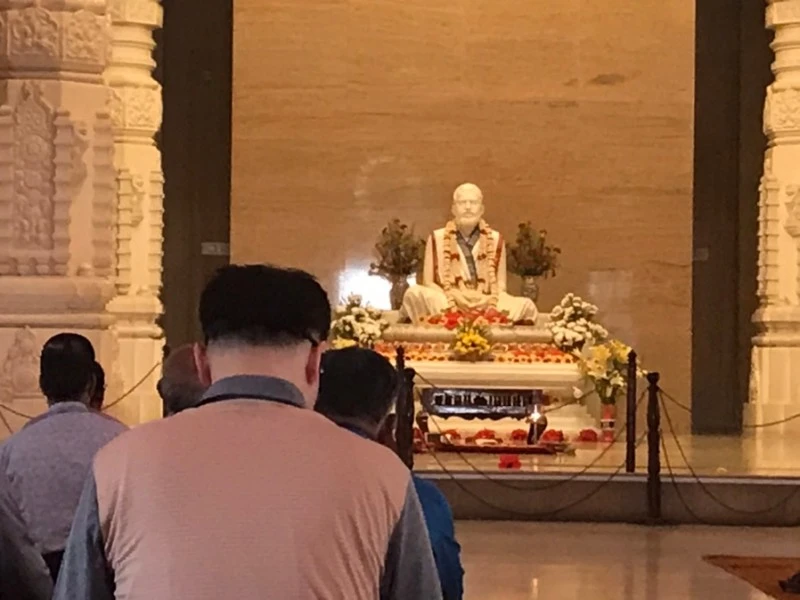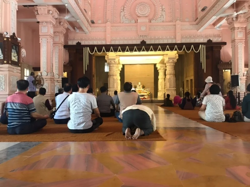 정면 중앙에 라마크리슈나가 좌정하고 계시네요. 라마크리슈나는 인도의 3대 성자로 손꼽히는 19세기 사상가입니다. 8세기의 인도 최고 철학자 샹카라(Shankara)와 수억 명의 신자를 거느린 석가모니 불타(佛陀)가 나머지 두 성자라는 점을 헤아린다면, 인도에서 그의 위치가 어느 정도인지 가늠할 수 있습니다. 성상(聖像)을 마주한 인도인들이 오체투지로 그에게 경의를 표합니다.