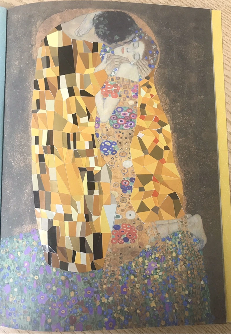 진료하는 틈틈이 한 땀 한 땀 스티커 붙여 얼마 전에 <키스>를 완성했어요. 클림트의 이 작품은 남녀의 이미지가 대조적으로 교차합니다. 남성의 옷은 직선적이고 무거운 사각형 무늬이지만, 여성의 옷은 둥글고 화려한 원생의 원형 무늬이죠. 대비되는 두 무늬는 중앙에서 만나 원형과 직선, 무채색과 유채색으로 조화롭게 어우러집니다.