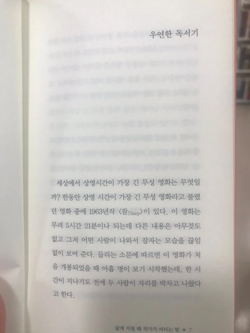 세상에서 가장 긴 무성영화는 1963년작 <잠sleep>이었답니다. 어떤 사람이 잠자는 모습을 무려 5시간 21분 동안 끊임없이 보여준대요. 곽재식의 <삶에 지칠 때 작가가 버티는 법>(출판사가 무려 북스피어) 첫 머리에서 알려줍니다.