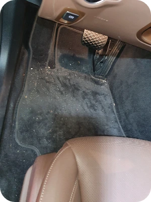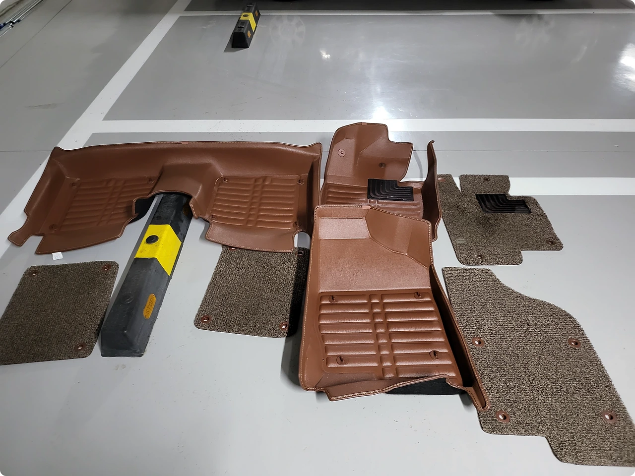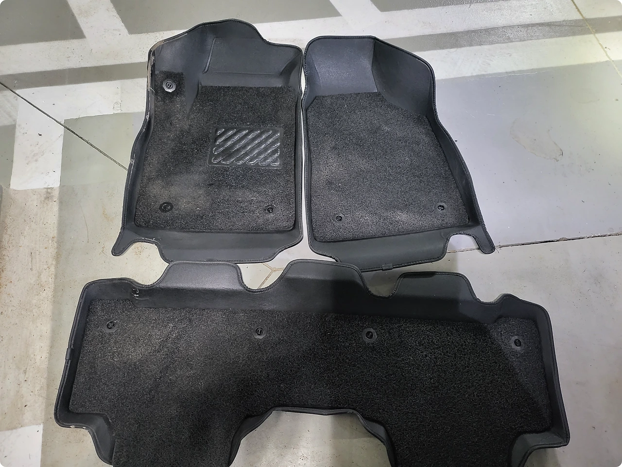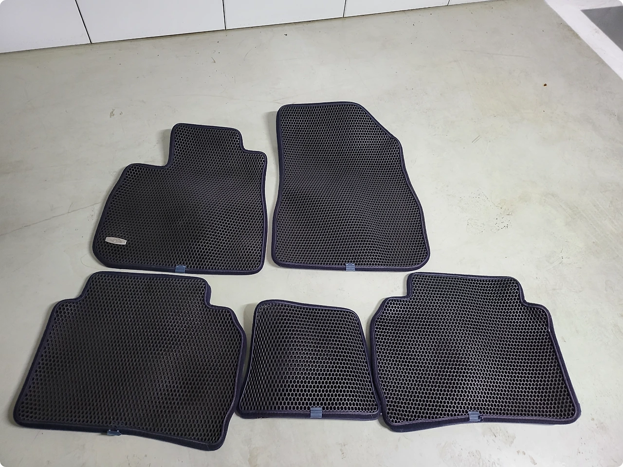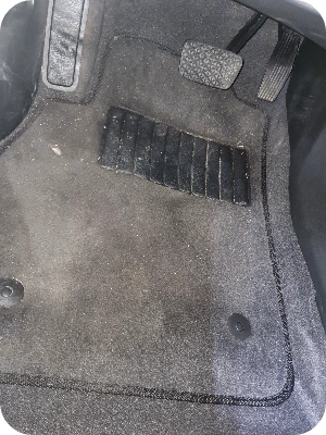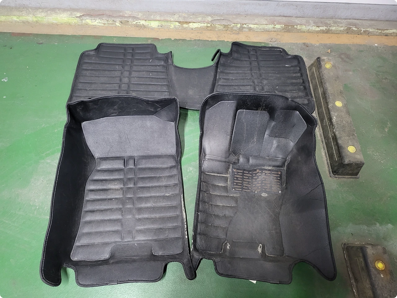 차를 구입하면 기본적으로 깔려있는 게 순정매트다. 카펫 타입으로 직물소재로 되어있다. 차 안의 수많은 먼지와 신발에서 떨어지는 흙과 모레 등을 흡착해 냄새의 원인이 되기도 한다. 물세척을 하면 건조시간이 필요하다. 장점이자 단점은 오염상태를 너무 적나라하게 보여준다는 것이다.