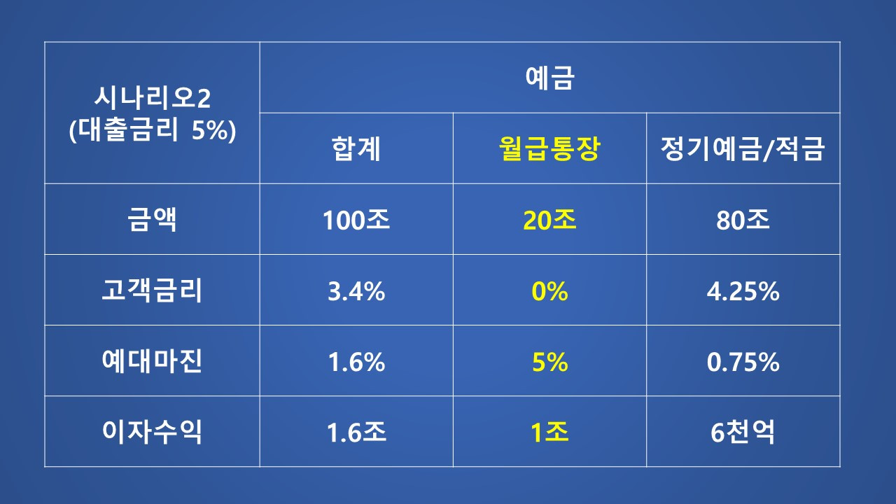 그런데 그 예금 중의 20조는 이자 한 푼 안 줘도 되는 월급통장으로 메꾸고 있다는 겁니다.