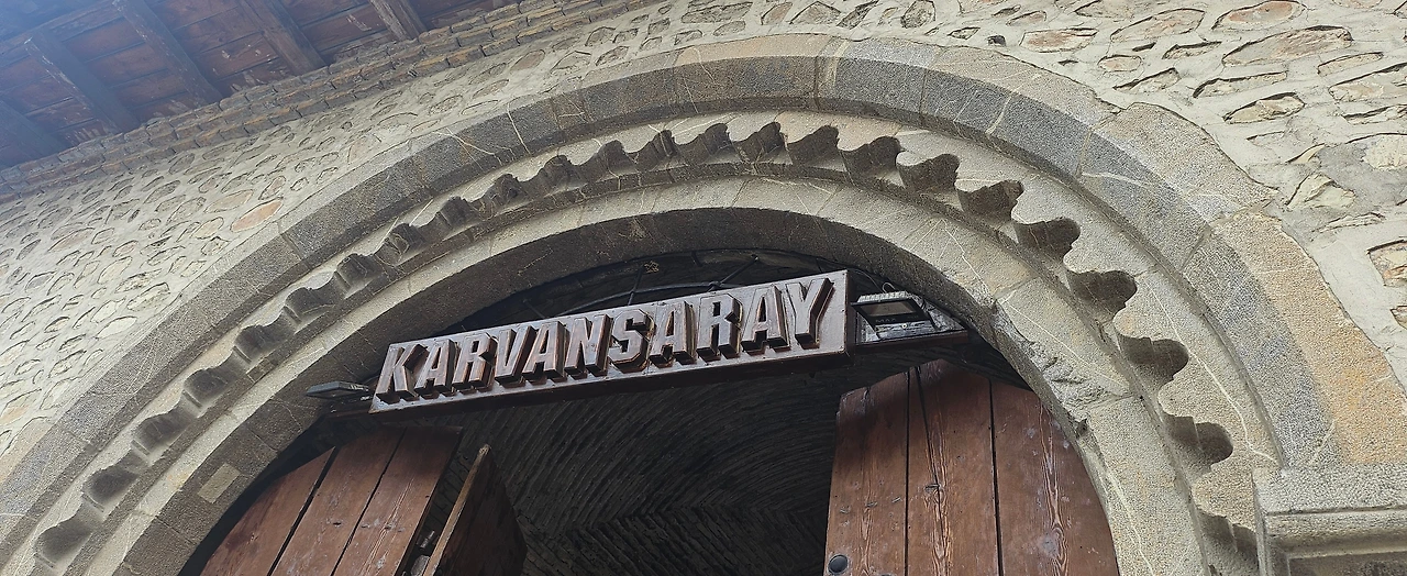 입구 상단의 간판은 현대적인 서체로 'KARVANSARAY'라고 쓰여 있지만,