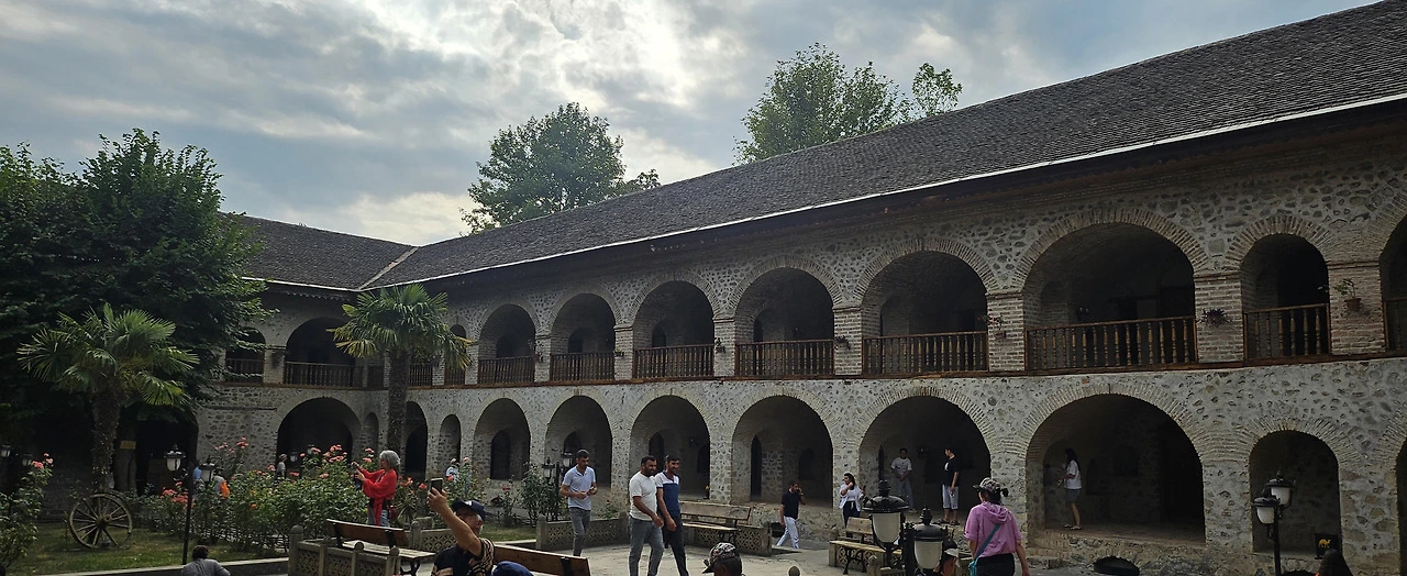 사진 속 건물은 아제르바이잔 세키(Şəki) 지역의 유명한 카라반사라이 호텔 중 하나를 찍은 것이다.
