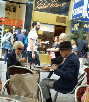 거리의 카페테리아에 앉아 식사를 했다.