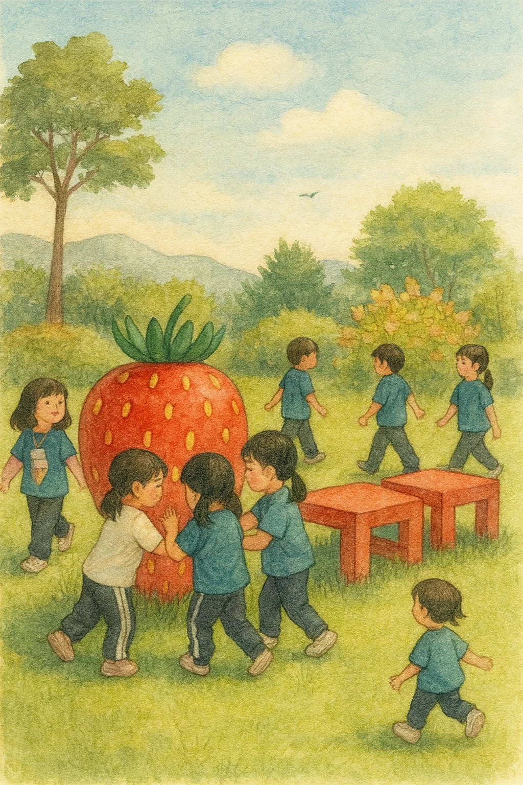 커다란 딸기 모형 앞에서 아이들은