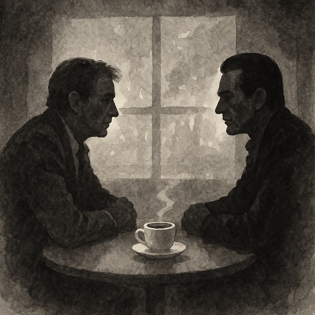 총 대신 커피를 사이에 둔 두 남자의 모습은