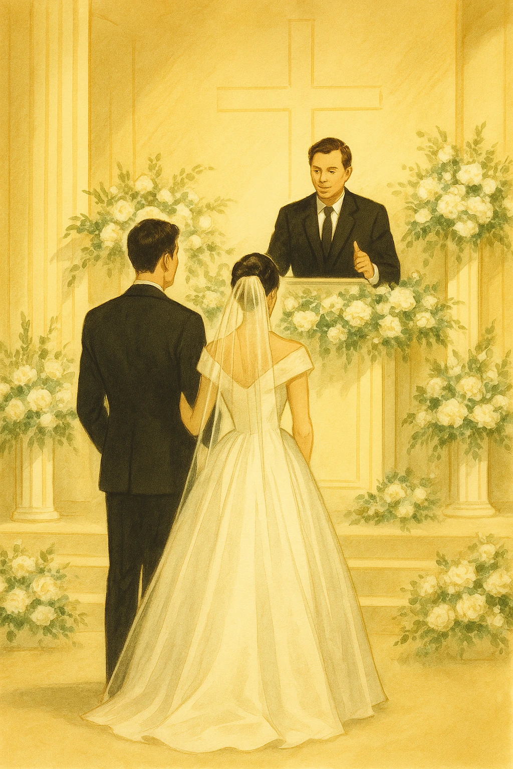 결혼식장에서 오늘 부부가 되는 젊은이의