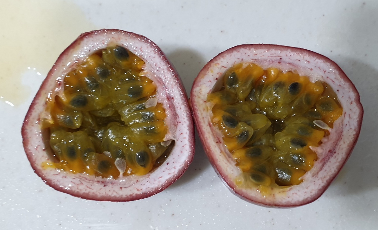 칼로 반을 잘라서 보면 생김새는 마치 올챙이 알처럼 생겨서 거부감을 갖는 사람도 있다. 하지만 과일 이름은 아주 섹시한 반전이 있는 ' 패션 후르츠'라는 과일이다.