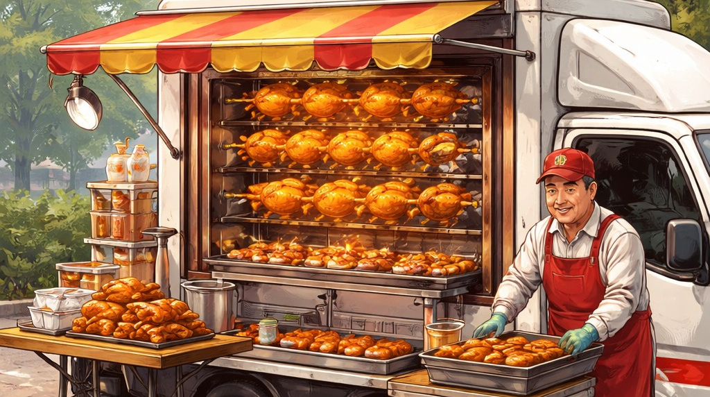 트럭 안에서 통닭이 빙글빙글 돌며,