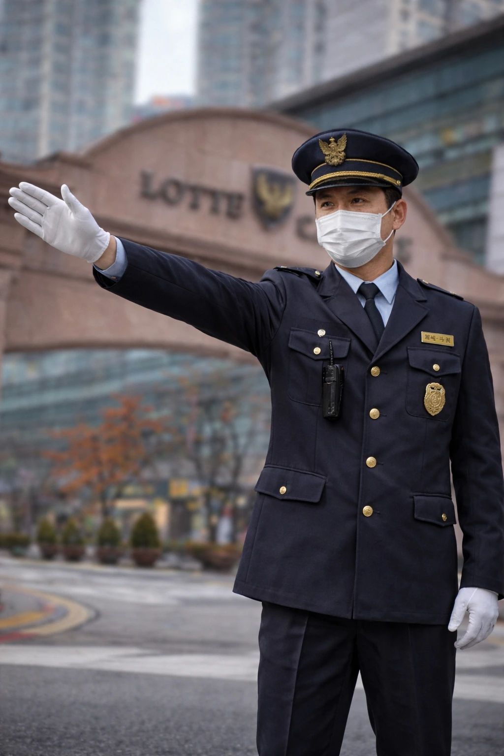 아파트 입구에 서서 수신호를 하는