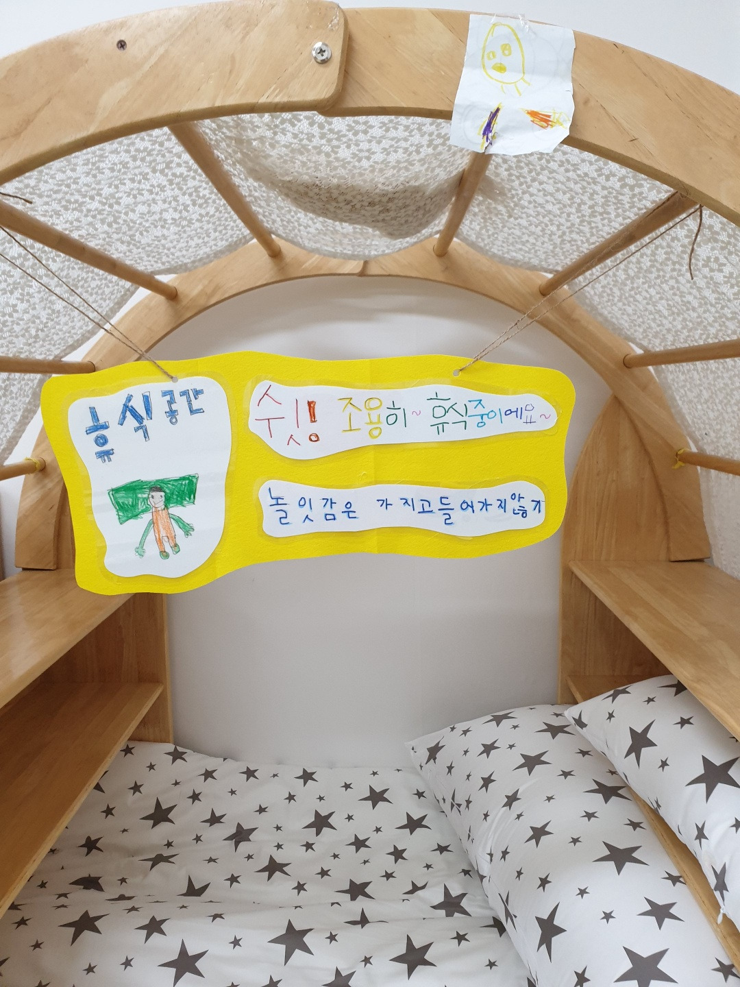 아이들이 놀다가 지쳐서 잠깐 휴식을 취하는 휴식영역에는 '놀잇감을 들고 들어가지 않는다'라고 표어를 붙여 놓았다.