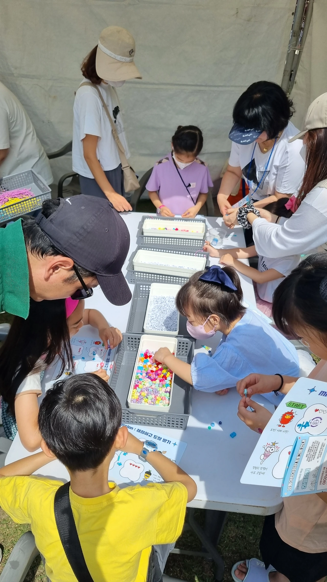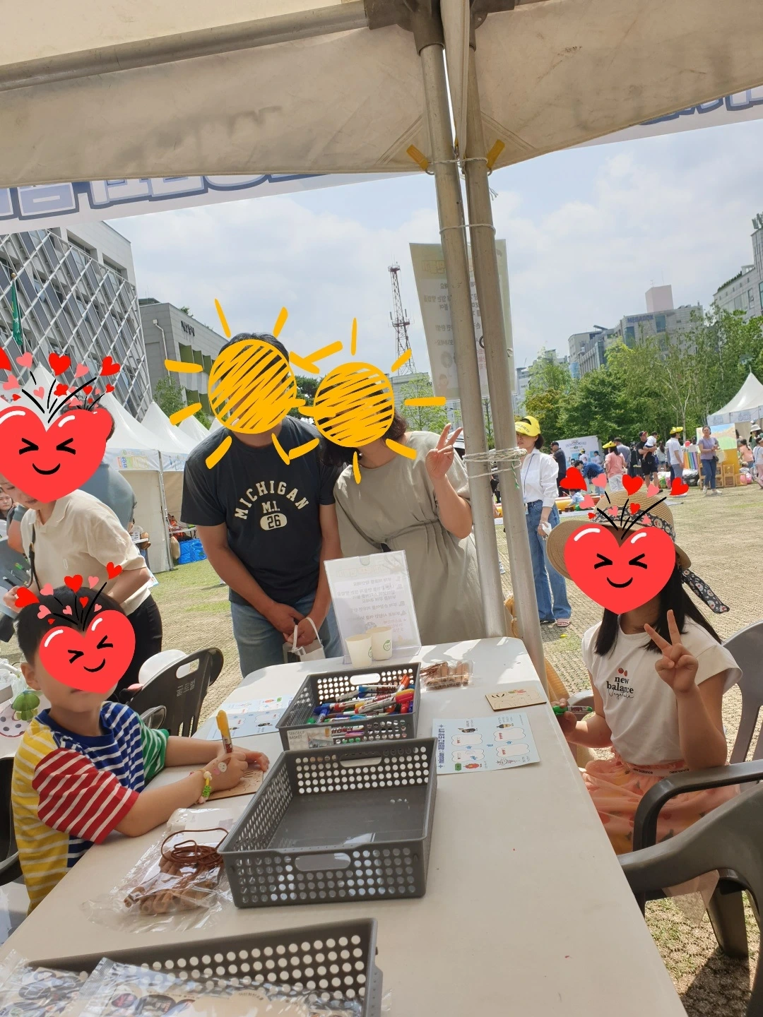 꼬물꼬물 손으로 조작해 보고, 그려보고, 꾸미는 사이에 태양이 더욱 작열하여도, 그늘이 없어도 가족들 대부분은 즐거워 보인다