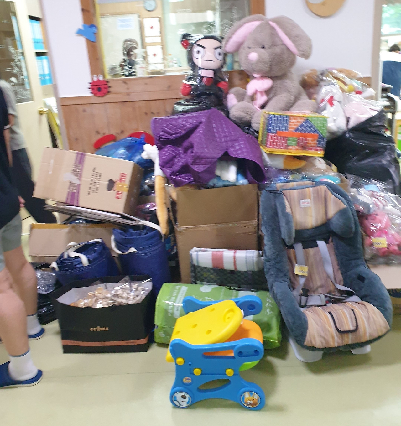 전날까지 각 어린이집에서는 가정에서 사용하지 않거나 쌓아 둔 물건들을 모아서 깨끗하게 빨아서 정리해서 어린이집으로 가져다주었다.