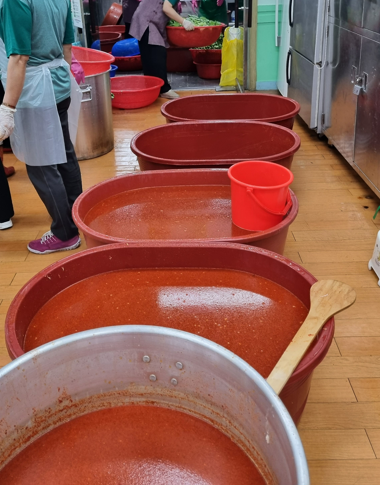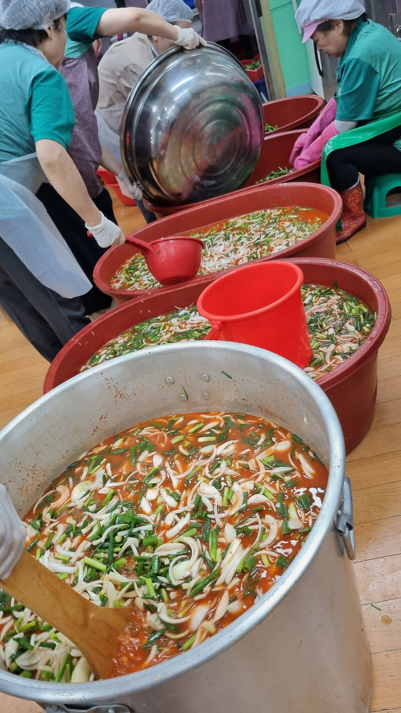 채소를 씻는 사람, 다듬는 사람, 양념을 만드는 사람, 버무리는 사람, 액젓을 붓는 사람, 풀을 쑤는 사람 그리고 밥을 짓는 사람, 김치통에 스티커를 붙이는 사람, 분리수거를 하는 사람 등 일을 너무나 잘하였다.