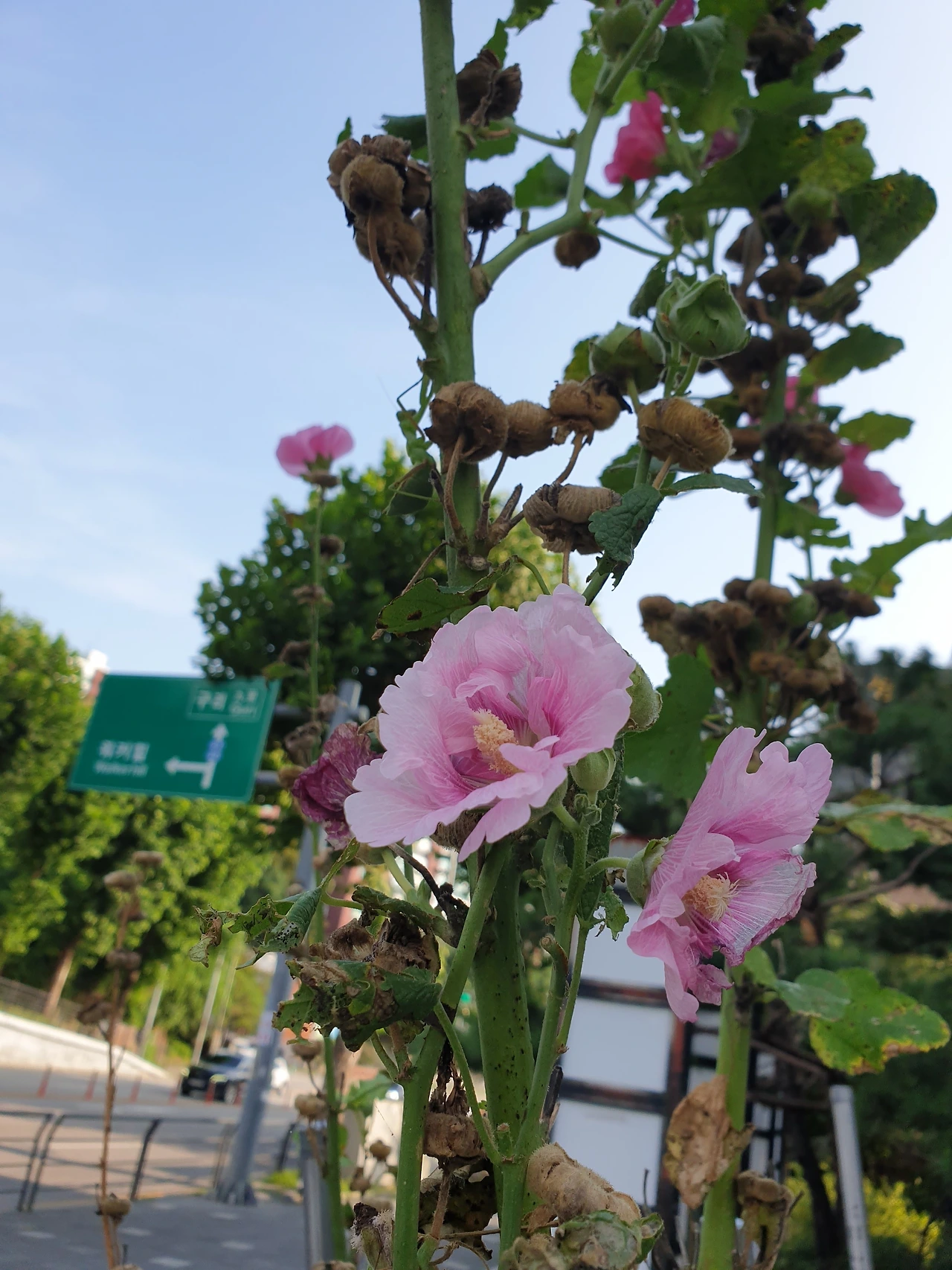 여름 끝자락 동네 어귀에서 아침 산책을 하다가 만난 접시꽃이 있었다.