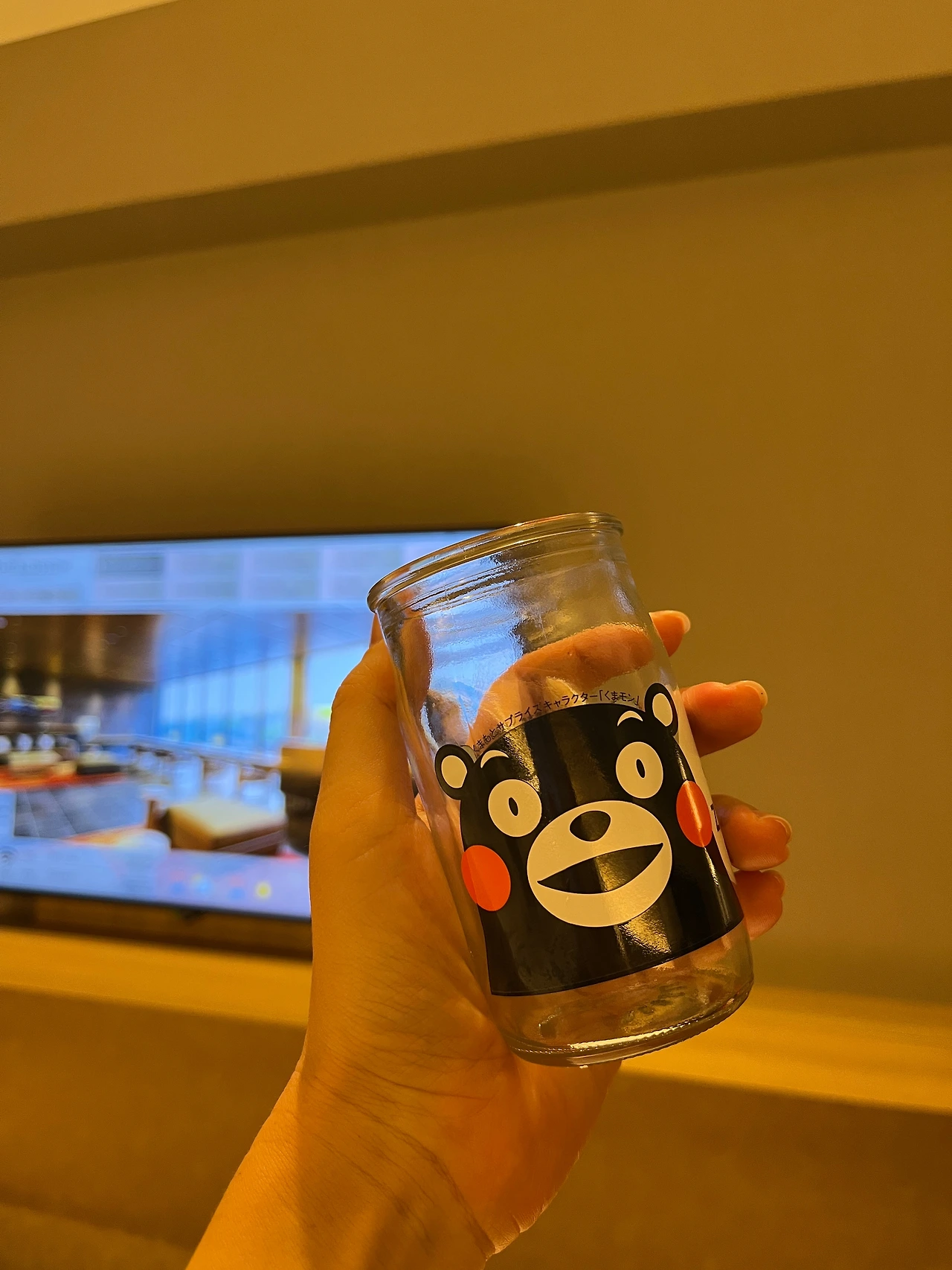 저녁식사를 마치고 쿠마몬이 그려진 유리잔 사케를 사들고 호텔로 들어왔다